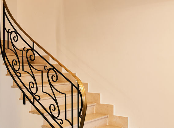 Un majestueux escalier en fer forgé mène au premier étage, où un palier orné de cadres de porte massifs distribue trois chambres. La suite parentale, d'une superficie de 52 m2, comprend un grand dressing, un espace nuit et une salle de bain divinement aménagée. Deux balcons offrent une vue sur la rue et le jardin. Deux autres chambres, dont une avec sa propre salle de bain, complètent cet étage.
